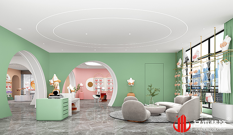 在前臺區(qū)域使用線條和弧形元素來增加空間的設(shè)計(jì)層次感,同時(shí)在整體設(shè)計(jì)當(dāng)中加入了莫蘭迪色系作為點(diǎn)綴元素,讓空間的設(shè)計(jì)層次感再次得到提升。不同子品牌采用的是不同的顏色,這樣容易讓大眾更好的識別,同時(shí)賦予子品牌不一樣的活力,再加上不同于常規(guī)造型的門,突出想要做出別樣的裝修設(shè)計(jì)風(fēng)格