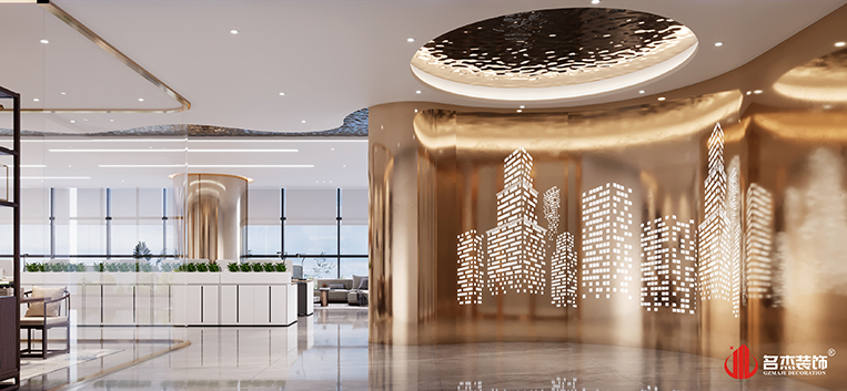 整個辦公空間使用土豪金的配色作為主調(diào)色,加入土豪金配色能夠讓辦公室裝修設(shè)計空間變得更有奢華的感覺,更能夠體現(xiàn)出新能源這個行業(yè)的發(fā)展是非常有前景的。前臺區(qū)域使用鋁材沖孔板作為背景墻,加入土豪金的顏色,一下子就能夠讓人感受到這個空間奢華感。在茶室區(qū)域使用弧形玻璃,搭配有造型的天花,設(shè)計感一下子就出來了。